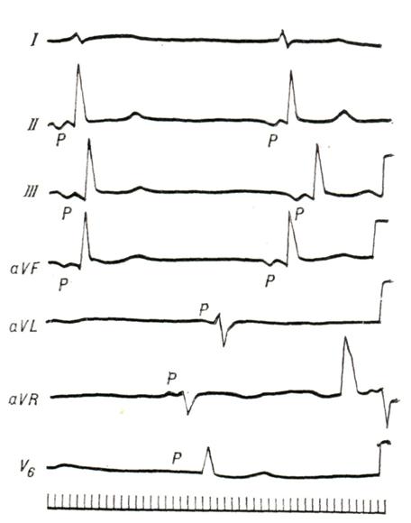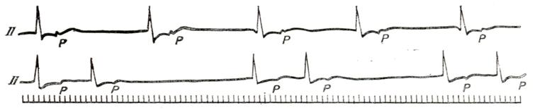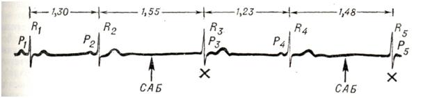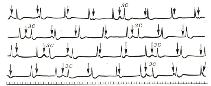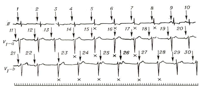 Частота импульсации из гетеротопного очага автоматизма выше, чем частота импульсации синусового узла (предсердные зубцы Р обозначены стрелками). Ретроградная проводимость из желудочков в предсердия отсутствует, поэтому большинство желудочковых комплексов не связано с предсердными зубцами Р. Однако если импульс возбуждения случайно достигает желудочков после окончания периода их рефрактерности, в фазу возбудимости, возникает синусовое «захваченное» сокращение (ЗС). Внизу — отметчик времени (0,1 сек.). Аритмии смешанного и неясного генеза.Атрио-вентрикулярная диссоциация — полная или частичная независимость сократительной деятельности желудочков от сокращений предсердий. Наиболее частая причина — это постоянная или транзиторная полная поперечная блокада (смотри Блокада сердца). Неполная атрио-вентрикулярная диссоциация связана с понижением активности синусового узла и повышением активности очагов импульсации низшего порядка, когда частота импульсации в двух источниках автоматизма становится почти одинаковой (изоритмическая диссоциация, рис. 6). Она возникает также, если ритм гетеротопного очага автоматизма чаще, чем ритм синусового узла, и отсутствует ретроградная проводимость из желудочков в предсердия (рис. 7). Последнюю форму называют интерферирующей диссоциацией. Различные формы атрио-вентрикулярной диссоциации могут встречаться как у практически здоровых людей (например, выскакивающие узловые сокращения; смотри выше), так и в результате лекарственных воздействий (дигиталис, противоаритмические средства) и многих заболеваний (инфаркт миокарда, миокардиты различной этиологии). Субъективно обычно ничем не проявляются, изредка больные жалуются на ощущение перебоев. Диагноз устанавливают с помощью электрокардиографии. Лечение направлено на борьбу с состоянием, вызвавшим аритмию (заболевание, интоксикация). Синдром преждевременного возбуждения желудочков — смотри Волъффа — Паркинсона — Уайта синдром. Реципрокные ритмы (эхо-ритмы, возвратные, взаимообратные ритмы). Сущность этих аритмий заключается в том, что один и тот же импульс в результате наличия в атрио-вентрикулярном узле патологической ретроградной проводимости (транзиторной или перманентной) возвращается к тому отделу сердца, в котором возник, и вызывает его повторное возбуждение (рис. 8). Патогенез неясен. Предполагают, что патологическая ретроградная проводимость связана с наличием в атрио-вентрикулярном узле двух изолированных проводящих путей, обладающих неодинаковой рефрактерностью. Источником реципрокных ритмов могут быть различные отделы сердца: предсердия, атрио-вентрикулярный узел и желудочки. Диагноз ставится на основании анализа ЭКГ. Для предсердных форм характерно наличие положительного зубца Р, нормальной продолжительности интервала PQ (R), правильной формы желудочкового комплекса и следующего за ним с укороченным интервалом отрицательного второго зубца Р (рис. 9). Наиболее часто встречающаяся атрио-вентрикулярная форма (рис. 10) характеризуется наличием на ЭКГ парных желудочковых комплексов, между которыми расположен деформированный отрицательный зубец Р (так называемые сендвичи), причем расстояние между парными желудочковыми комплексами не превышает 0,5 секунд. Желудочковые формы также имеют вид спаренных желудочк