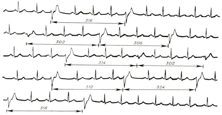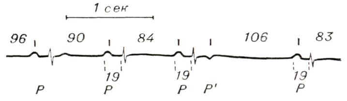 На фоне синусового ритма видны появляющиеся почти через равные промежутки времени деформированные желудочковые комплексы, расстояние между которыми соответствует 302—324 сек. Частота импульсации в синусовом узле — 78 в 1 мин., в очаге гетеротопного автоматизма — 19 в 1 мин. Цифры на рисунке — интервалы времени в сотых долях секунды.