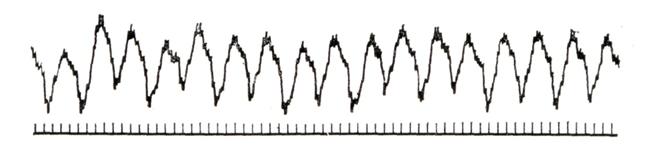 В отведении V1 и большинстве отведений, регистрируемых из полости правого предсердия (Е), регистрируются регулярные волны трепетания (обозначенные вертикальными черточками под отведением Е). Однако на электрокардиограмме, зарегистрированной в одном из участков правого предсердия (Е8), видны беспорядочные зубцы мерцания, имеющие значительно большую частоту, чем волны трепетания. Внизу — отметчик времени (0,01 сек.). Электрическая альтернация сердца. Неравномерность ЭДС сердца в разных комплексах, по-видимому, является результатом повреждения или истощения части мышечных волокон. Встречается при заболеваниях миокарда, интоксикации наперстянкой. Далеко не всегда сочетается с альтернацией пульса. Диагноз устанавливается с помощью электрокардиографии. Отмечается уменьшение амплитуды QRS в каждом четном комплексе, однако расстояние между желудочковыми комплексами одинаково, и каждому из них предшествует нормальный зубец Р. Альтернация пульса — смотри Пульс. Парадоксальный пульс—смотри Пульс.