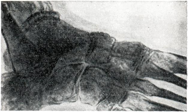 Диагностика гонорейного артрита очень затруднительна ввиду того, что больные скрывают или не знают о перенесенном заболевании, а клиническая картина может быть сходна с ревматоидным артритом. Диагностическое и дифференциально-диагностическое значение имеют анамнез, наличие первичного гонорейного очага, положительная реакция Борде — Жангу, положительная кожная проба с гоновакциной, в некоторых случаях наличие гонококков в суставном выпоте, данные общего анализа крови, рентгенологического исследования. Прогноз в большинстве случаев благоприятный, но острые гнойные формы могут привести к значительным нарушениям функции сустава, а подострые — принять хроническое рецидивирующее течение. Лечение: в острой стадии заболевания необходимо провести курс лечения антибиотиками, в тяжелых случаях применяют кортикостероиды и аутогемотерапию; при хроническом течении заболевания в период ремиссии показаны ЛФК, массаж, парафиновые, озокеритовые и грязевые аппликации на суставы, курортное лечение (радоновые и сероводородные ванны, грязелечение). Смотри также Гонорея. Грибковый артритГрибковый артрит может встречаться при актиномикозе, бластомикозе, кокцидиозе и мадурской стопе. В сустав процесс, как правило, переходит из близлежащей пораженной микозом кости. В некоторых случаях актиномикоз распространяется также гематогенным путем, поэтому могут поражаться кости и суставы, расположенные далеко от первичного очага, например стопа (рис. 15). Для всех грибковых поражений костно-суставного аппарата характерно образование свищей и длительное рецидивирующее течение. Диагноз всегда должен быть подтвержден обнаружением соответствующего грибка. Дифференцировать грибковый артрит следует с туберкулезным и сифилитическим поражением костно-суставного аппарата. Лечение — антибиотики, сульфаниламиды, иногда актинолизат и другие, — хирургическое вмешательство (удаление очага). Дизентерийный артритДизентерийный артрит (arthritis dysenterica) развивается сразу или спустя несколько недель после перенесенной дизентерии. В настоящее время встречается редко. Как правило, это токсико-аллергические серозные или серозно-фибринозные синовиты, которые протекают в виде полиартрита, а иногда моноартрита коленного или голено-стопного суставов. Суставы очень болезненны, отмечается припухлость, деформация. Суставной выпот богат фибрином, полинуклеарами, но возбудитель обнаруживается чрезвычайно редко. Общее состояние больного меняется незначительно, несмотря на длительное и стойкое поражение суставов. В процесс часто вовлекаются крестцово-подвздошные суставы, характерна умеренная атрофия мышц. На рентгенограммах отмечается обычная картина артрита (остеопороз, изменения суставной щели, неровность суставных поверхностей).