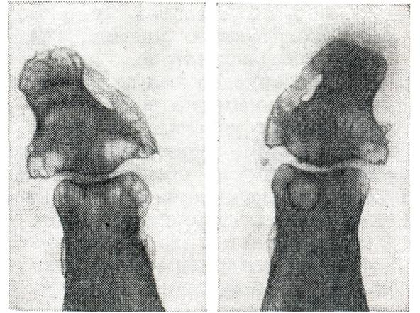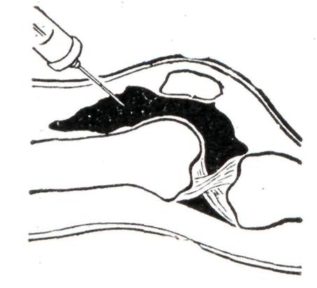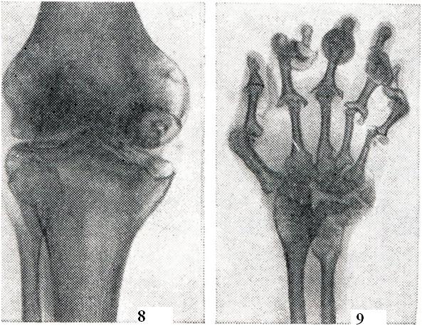 Прогноз благоприятный, но при хроническом рецидивирующем течении могут развиться контрактуры, стойкая деформация и даже фиброзный анкилоз. Лечение: антиревматическая терапия не эффективна. Необходим полный покой, удобное положение сустава, сухое тепло. Хороший эффект дает применение антибиотиков. В тяжелых случаях, кроме обычной десенсибилизирующей терапии, применяются кортикостероиды, при уменьшении активности процесса — ЛФК, массаж, парафиновые, озокеритовые или грязевые аппликации. Паразитарный артритПаразитарный артрит (arthritis pa-rasitaria) может развиться при эхинококковом поражении костей. Эхинококк чаще всего локализуется в позвонках, межпозвонковых дисках, реже в костях таза и длинных трубчатых костях. Суставные боли обычно связаны с реактивным синовитом, вызванным процессом в близлежащей костной ткани. Лечение — смотри Эхннококкоз. Пневмококковый артритПневмококковый артрит наблюдается очень редко, в основном у детей и людей молодого возраста при крупозном воспалении легких. Бактериально-метастатическая форма чаще всего поражает один сустав (коленный, голено-стопный) и протекает как гнойный артрит (в суставном пунктате обнаруживаются пневмококки). При токсико-аллергической форме поражаются многие суставы, но процесс протекает легко, с полной обратимостью всех явлений, специфических лечебных мероприятий не требуется. Лечение гнойных форм — смотри ниже Острый гнойный артрит. Септический артритСептический артрит (arthritis septica) развивается на фоне общего сепсиса, чаще всего вызванного кокковой микрофлорой, кишечной палочкой и другим. В большинстве случаев артрит имеет бактериально-метастатический (острый гнойный артрит), а иногда токсико-аллергический генез. При бактериально-метастатической форме развивается острый гнойный артрит, чаще крупных суставов, с ярко выраженной клинической картиной — смотри ниже Острый гнойный артрит. Токсико-аллергическая форма септического артрита — это острый и подострый мигрирующий полиартрит с небольшим выпотом серозного или серозно-фибринозного характера. Процесс протекает с обратимостью всех явлений. Лечение: антибактериальная терапия сепсиса, противовоспалительные препараты (салицилаты, индометацин), а при необходимости применяют глюкокортикоидные гормоны. Сифилитический артритСифилитический артрит (arthritis syphilitica) может появляться при врожденном и во всех стадиях приобретенного сифилиса. В наст, время встречается редко. При врожденном сифилисе может быть несколько форм артрита: сифилитический остеохондрит Парро, синовит коленных суставов со значительным количеством выпота и шарообразной формой коленных суставов — суставы Клаттона, сифилитический дактилит и другое. Артрит в первой стадии сифилиса может проявляться кратковременной поли-артралгией. Во второй стадии также отмечаются боли в суставах, костях и мышцах, усиливающиеся ночью. Иногда наблюдается полиартрит летучего характера, при котором не помогают салицилаты, но хороший эффект дает лечение пенициллином. В третьей стадии может быть гуммозный артрит крупных суставов, который проявляется гидрартрозом с выпячиванием заворотов синовиальной оболочки (рис. 16). На рентгенограммах могут наблюдаться признаки артроза (вторичный артроз). Если процесс локализован в одном суставе, его внешне трудно отлич