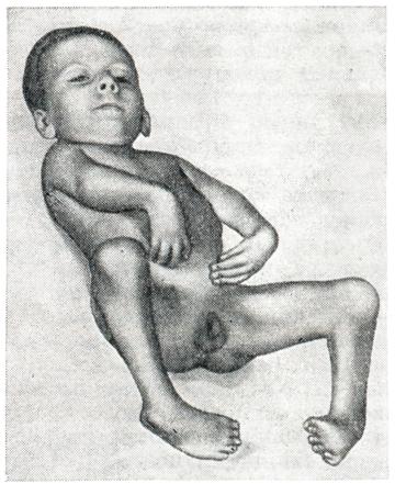 Клиническая картина чрезвычайно разнообразна. Она проявляется в виде множественных контрактур суставов верхних и нижних конечностей (смотри рисунок), обусловленных резкой аплазией мышц (при морфологическом исследовании наблюдается картина грубых поражений мышечной ткани по типу фиброзной дистрофии). При осмотре обнаруживается характерное для артрогрипоза сглаживание контуров суставов, рельефа мышечных групп и ограничение подвижности в пораженных суставах. На верхних конечностях чаще наблюдаются разгибательные контрактуры локтевых суставов, нарушение хватательной функции кисти. На нижних конечностям контрактуры суставов отличаются большим разнообразием (сгибательные и разгибательные, приводящие и отводящие) и встречаются в различном сочетании. Кроме контрактур, наблюдаются вывихи бедра. Позвоночник и мышцы туловища обычно не страдают.