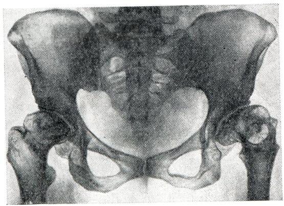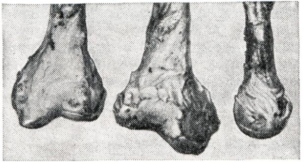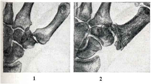 Вторичные артрозы характеризуются развитием изменений в суставных отделах костей на фоне первичного процесса, который рентгенологически может проявляться в виде деформации кости и изменения ее структуры. В результате основного процесса наиболее резко изменяется одна из костей, участвующих в образовании сустава. Остальные кости обычно (при отсутствии воспалительного процесса) страдают значительно меньше. Суставной конец кости деформируется, уплощается и нередко разрушается (рис. 8). Структура губчатого вещества кости подвергается перестройке, что проявляется остеолитическими и остеосклеротическими изменениями. В дальнейшем патологические состояния костей, образующих сустав, заканчиваются развитием вторичного артроза, степень выраженности которого зависит от характера основного процесса. При вторичном артрозе определяется сужение суставной щели, утолщение поверхностей костей за счет краевых костных разрастаний и образование очагов кистозной перестройки.