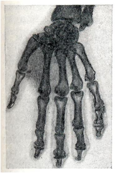 Кроме перечисленных общих клинических и рентгенологических симптомов, артрозы отдельных суставов имеют некоторые дополнительные особенности. Артроз дистальных межфаланговых суставов пальцев рук (геберденовские узелки, геберденоартроз) представляет собой одну из наиболее частых локализаций первичного артроза, обычно поражает женщин, особенно в климактерическом и постклимактерическом периодах. Геберденовские узелки (рис. 9, 10) считаются ранним проявлением первичного генетически обусловленного полиартроза, который одновременно связывают с перегрузкой дистальных межфаланговых суставов мелкой и напряженной работой. Геберденовские узелки развиваются очень медленно, бессимптомно, часто незаметно для самого больного. Лишь в поздние сроки появляются небольшие боли, обычно при смене погоды, небольшая болезненность при пальпации и образуются заметные возвышения по обеим сторонам тыльной поверхности дистальных межфаланговых суставов. На рентгенограмме отмечается сужение суставных щелей, неровность суставных поверхностей, подхрящевой склероз и боковые остеофиты. Артроз проксимальных межфаланговых суставов пальцев рук (бушаровские узелки) встречается значительно реже, чем геберденовские узелки, но по своей клинической и рентгенологической картине от последних почти не отличается. Как правило, бушаровские узелки появляются у лиц, имеющих геберденовские узелки (рис. 9). Это помогает отличить их от ревматоидного артрита, при котором очень часто поражаются проксимальные межфаланговые и пястно-фаланговые суставы раздельно или совместно. Кроме того, деформация сустава при бушаровских узелках обусловлена не утолщением мягких тканей (как при артритах), а твердыми костными разрастаниями. Артроз запястно-пястного сустава I пальца (ризартроз большого пальца) встречается примерно так же часто, как и геберденовские узелки. При этом оба поражения могут быть одновременно. Причиной ризартроза является частая микротравматизация. Клиническая и рентгенологическая картина (рис. 11) — такая же, как и при артрозе двух предшествующих локализаций. Артроз локтевого сустава наблюдается реже в связи с уменьшенной на него нагрузкой. Однако при некоторых видах труда, особенно с виброинструментами, создаются иногда условия для длительной микротравматизации этих суставов и для развития профессионального артроза (у шахтеров, кузнецов, литейщиков, каменщиков и др.), который проявляется резкими болями, усиливающимися после полного сгибания и разгибания в суставе. Вскоре наступает некоторое ограничение его подвижности. Часто отмечается грубый хруст в суставе при движениях. Кроме сужения суставной щели (рис. 12), подхрящевого остеосклероза и краевых остеофитов, часто наблюдаются суставные мыши, представляющие собой либо кусочки оторвавшегося и затем обызвествленного хряща (например, при расслаивающемся остеохондрите), либо проявление суставного хондроматоза. Артроз тазобедренных суставо в (коксартроз) является одной из наиболее частых и тяжелых форм дегенеративных заболеваний суставов. Раннее нарушение функции этих суставов, как уже указывалось, вызвано их особой анатомической структурой. Особенно велик удельный вес вторичных форм коксартрозов, обусловленных врожденными дисплазиями, вывихами и подвывихами бедра, перенесенными з