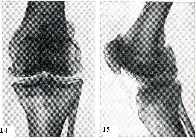 Последнее обстоятельство обусловливает частое возникновение так назвыаемого хондромаляции надколенника у лиц молодого и среднего возраста, после чего развивается гонартроз. Большую роль в развитии гонартроза играет ожирение: во-первых, существенно увеличивается нагрузка на коленнные суставы; во-вторых, увеличение внутрисуставного отложения жировой ткани затрудняет и без того сложные условия питания суставного хряща. Клинические симптомы гонартроза весьма разнообразны. В начальном периоде отмечаются боли при восхождении, еще больше — при спуске по лестнице, при вставании после покоя, а также в сырую и холодную погоду и после длительного нахождения на ногах. Иногда боли острые, что может быть обусловлено раздражением синовиальной оболочки кусочками оторвавшегося хряща и развитием реактивного синовита. При этом возможно скопление большого количества экссудата и выбухание супрапателлярной сумки и карманов суставной капсулы. Грубый хруст в начальном периоде болезни определяется при пальпации, а в далеко зашедших случаях выслушивается на расстоянии. Отмечается болезненность ниже надколенника, по его краям и при смещении надколенника в медиальном и латеральном направлении. При исследовании синовиальной жидкости обнаруживают умеренное увеличение концентрации белка и увеличение вязкости (в отличие от ревматоидного артрита, при котором вязкость снижена). Число лейкоцитов в ней не превышает 3000 в 1мм3, среди них лишь четверть составляют полинуклеары (при ревматоидном артрите цитоз до 20 000 лейкоцитов в 1 мм3, ¾ из них составляют полинуклеары). Немаловажное значение в дифференциальной диагностике гонартроза с ревматоидным артритом коленных суставов имеет морфологическое исследование материала синовии, полученного при биопсии. На рентгенограммах коленных суставов (рис. 14 и 15) характерные для артроза изменения: сужение суставной щели, подхрящевой склероз, краевые остеофиты и кистовидная перестройка прилегающих частей костей. К числу ранних рентгенологических признаков гонартроза относятся заострения межмыщелковых бугорков болынеберцовой кости. Наблюдаются также мелкие эрозии в нижней трети задней поверхности надколенника, сужение щели между надколенником и бедренной костью и остеофиты на верхнем и нижнем краях надколенника. При гонартрозе часто поражаются суставные мениски, особенно медиальный. Это приводит к резкому сужению суставной щели или к О-образной или Х-образной деформациям. Гонартроз может быть вторичным (в результате травм, перенесенных артритов, повреждений менисков, расслаивающегося остеохондрита, хондроматоза и другого) либо первичным (возникающим без заметной причины, возможно, в результате старения хряща или длительной профессиональной перегрузки). Чаще, чем артроз другой локализации, гонартроз осложняется синовитом. В этом случае говорят о гонартрозе с реактивным синовитом.