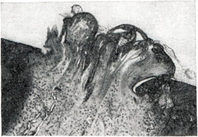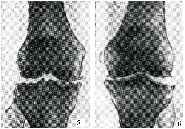 В субхондральных отделах отмечаются явления лакунарной резорбции и новообразования кости, а в зонах костных «шлифов» развивается остеосклероз. В более глубоких отделах эпифиза преобладает остеопороз с образованием кист, окруженных поясом склерозированной кости. Здесь же встречаются островки хрящевой ткани, которые, по мнению некоторых авторов, представляют собой разрастания хрящевой мозоли, распространяющейся из глубоких отделов необызвествленной зоны суставного хряща. В редких случаях островки хрящевой ткани в виде своеобразных «грыж» выбухают над поверхностью костных шлифов (рис. 4). Фиброзные и костные анктшозы при деформирующем артрозе, в отличие от артритов, не развиваются. Любой артроз развивается и протекает очень медленно и никогда не приводит к тяжелым нарушениям функции суставов и особенно к фиброзному и костному анкилозу. Исключением является тазо-бедренный сустав, отличающийся своими анатомическими особенностями (глубокая суставная яма, вмещающая около 2/3 головки бедренной кости, и сравнительно узкая суставная щель, быстро уменьшающаяся при любом патологическом процессе). В этом суставе очень рано наблюдается ограничение подвижности и вовлечение в процесс мышечно-связочных элементов, что в далеко зашедших случаях нередко является причиной инвалидизации больных. Однако анкилоз и в данном случае не наступает, если к артрозу не присоединяется воспалительный процесс. Любая форма артроза протекает без общих признаков воспаления (ускорение РОЭ, диспротеинемия, повышение температуры, исхудание и другого). Первичный артроз часто сопровождается нарушением жирового обмена, артериальной гипертензией, атеросклерозом и другими заболеваниями. Очень важной чертой артроза является несоответствие между морфологическими изменениями в суставах, наблюдаемыми на рентгенограммах, и клиническими проявлениями болезни. Иногда при незначительных рентгенологических изменениях отмечаются сильные боли и ограничение подвижности. В других случаях при значительных рентгенологических изменениях клинические симптомы оказываются весьма умеренными. Это зависит от нескольких причин. Во-первых, суставной хрящ полностью лишен сосудов и нервов. Поэтому его поражение не дает симптомов до тех пор, пока патологический процесс не выходит за пределы самого хряща. Во-вторых, синовиальная мембрана, суставная капсула, сухожилия и мышцы, имеющие многочисленные нервные рецепторы, воспринимающие боль, не во всех суставах поражаются в одно и то же время и в той же степени. В-третьих, не у всех больных артрозом развивается одинаково быстро: чем медленнее он начинается и протекает, тем менее выражены клинические симптомы, так как организм успевает использовать все компенсаторные приспособления. Суставные симптомы артроза складываются из болей, чувства скованности, быстрого утомления, тугоподвижности, деформаций, хруста и другого. Боли обычно тупые. Они непостоянны, усиливаются в холодную и сырую погоду, после длительной нагрузки (например, к вечеру) и при начальных движениях после состояния покоя («стартовые боли»). В тазо-бедренных суставах боли иррадиируют в паховую либо седалищную область (при этом отмечается напряжение отводящих мышц и сгибателей бедра). Очень часто, особенно при старческих артрозах, вместо болей отмечаетс