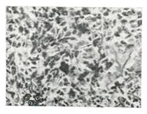 По микроскопическому строению выделяют остеопластический, остеолитический и смешанный морфологические варианты опухоли, в основном — по степени опухолевого костеобразования. Остеопластический (остеосклеротический) вариант характеризуется наклонностью к образованию атипичной опухолевой кости, которая интенсивно обызвествлена и в некоторых участках подвергается эбурнеации. Остеолитический вариант отличается слабо выраженными, но весьма разнообразными процессами опухолевого остеогенеза — от участков необызвествлениого опухолевого остеоида до формирования атипичных костных структур. Преобладает клеточный опухолевый компонент, обычно полиморфного состава, нередко с гигантскими одно- и многоядерными формами и значительным количеством фигур деления (рис. 2). При смешанном варианте наблюдается наличие хрящевого компонента. Клеточный состав остеогенной саркомы чрезвычайно разнообразен. В одних опухолях клетки сходны с остеобластами, в других или в разных зонах одной и той же опухоли создается картина, сходная с фибросаркомой; клетки могут приобретать такую степень анаплазии, что опухоль со слабо выраженными признаками остеогенеза может быть названа полиморфно-клеточной саркомой. В периферических отделах опухоли (обычно вблизи надкостницы) отмечается реактивное костеобразование.