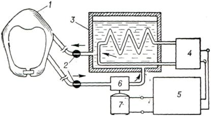 Электрическая активность коры головного мозга до t° 30° (в пищеводе) при правильном проведении гипотермии искусственной не изменяется. На электроэнцефалограмме сохраняется альфа- и бета ритм. При дальнейшем снижении температуры возникает замедление ритма, появляются тета- и дельта-волны и периоды «молчания» электроэнцефалограммы. Исчезновение электрической активности головного мозга, по данным Исикавы и Окамуры (Y. Ishikawa, H. Okamura, 1958), происходит при t° 20—18°, а по наблюдениям Кеньона У. R. Кепуоп, 1959) — при t° 15—12°. ПоказанияФункция центров промежуточного мозга утрачивается, по данным Ди Макко (L. Di Macco, 1954), при t° 29—28°, а центров продолговатого мозга — при t° 24° [А. Долъотти, Чиокатто (Е. Ciocatto), 1954]. Электрическая активность сердца при гипотермии искусственной постепенно угнетается, возникает синусовая брадикардия и замедляется проведение возбуждения. При охлаждении до температуры ниже 28° из-за повышения возбудимости миокарда возрастает риск фибрилляции желудочков. Поэтому t° 28° считают границей умеренной гипотермии искусственной, достижение которой допустимо без использования аппаратов, способных заменить насосную функцию сердца. Для глубокой гипотермии искусственной необходимо применение аппаратов искусственного кровообращения (смотри ниже). Гипотермию искусственную применяют в основном при хирургическом лечении больных с пороками сердца, при некоторых нейрохирургических операциях и при терминальных состояниях, а также для лечения злокачественной гипертермии. При хирургическом лечении больных с пороками сердца гипотермия искусственная имеет абсолютные показания, когда необходимо выключение сердца из кровообращения сроком на 6—10 минут (коррекция вторичного межпредсердного дефекта, изолированного стеноза легочной артерии), и относительные — при операциях, когда вероятно возникновение гипоксии, даже если они не сопровождаются прекращением общего кровообращения (создание межартериального анастомоза, устранение коарктации аорты). Гипотермия искусственная применяют также в системе реанимационных мер при гипоксии и отеке мозга. МетодикаНаиболее существенными сторонами методики гипотермии искусственной является способ снижения температуры тела и метод блокады реакции организма на охлаждение. Обычно реакция на охлаждение выражается дрожью, пиломоторным эффектом, периферической вазоконстрикцией, увеличением концентрации катехоламинов в крови, гипергликемией и, в конце концов, повышением потребления кислорода. Она не только сводит на нет преимущества гипотермии искусственной, но и сама по себе потенциально опасна, так как приводит к ацидозу и гипоксии. Блокада реакции на охлаждениеБлокада реакции на охлаждение может быть достигнута применением нейроплегии, глубокого наркоза или поверхностного наркоза в сочетании с глубокой кураризацией. Нейроплегия сыграла важную роль в развитии гипотермии искусственной, так как она в принципе позволяет полностью блокировать реакцию нейровегетативной системы на охлаждение. Однако она устраняет наряду с патологическими, также и полезные для организма реакции. Оказалось, что полная ареактивность нейровегетативной системы при гипотермии искусственной, особенно во время операций, сопровождающихся выключением сердца из кровообращения, нецелесообразна. Поэтому ней