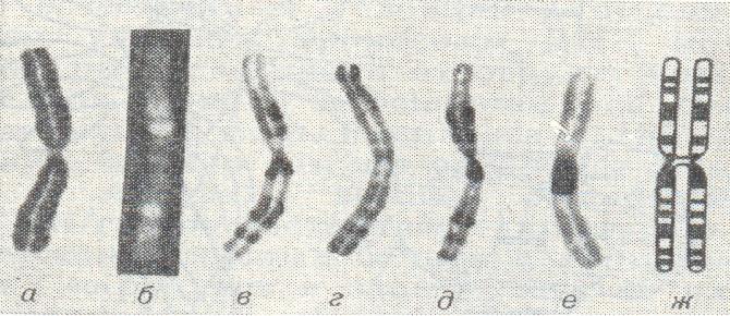 Рисунок №4 Хромосома 1 человека при разных способах окраски: а - сплошная окраска; б - Q-окраска; в - G-окраска; г - R-окраска; д - рисунок последовательности репликации ДНК, выявлюемый с помощью 5-бромдезоксиуридина; е - С-окраска; ж - схема дифференцированности хромосомы по длине. |