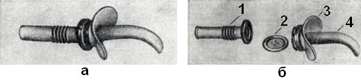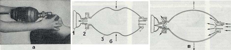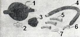 Дыхательная трубка ТД-1.02 состоит из разъемных мундштука с гофрировкой, нереверсивного клапана, нагубника, воздуховода (рис. 16). Аппараты ДП-10.О2, АДР-2 состоят из дыхательного латексного мешка в резиновой камере, двух нереверсивных клапанов и клапанного устройства для подачи кислорода. В комплекты входят аппараты, гофрированная трубка, маски, патрубки для кислорода, роторасширитель, языкодержатель и другое (рис. 17).