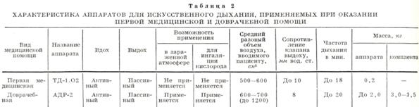 При оказании первой медпомощи в военно-полевых условиях применяют дыхательную трубку ТД-1.О2, а на этапах медицинской эвакуации — портативные ручные аппараты ДП-10.О2, АДР-2 и автоматы ДП-9.02, аппараты искусственного дыхания на пневмоэлементах Пневмат-1 (с фиксированными параметрами дыхания), на пневмоэлементах (УСЭППА) ЛАДА, аппараты искусственного дыхания Фаза-1, Фаза-2. Они удобны и надежны в работе. Кроме дыхательной трубки, все аппараты могут использоваться в зараженной атмосфере благодаря наличию приспособления для подсоса воздуха через коробку противогаза. Укладки металлические, пылебрызгозащищающие (кроме ТД-1.02). Основные характеристики ручных аппаратов приведены в табл. 2.