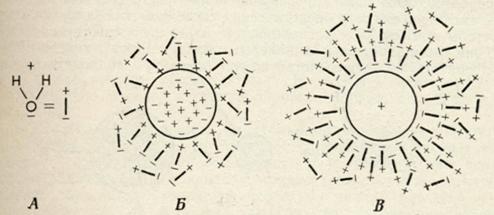 Введение в коллоидный раствор веществ, нейтрализующих заряд коллоидных частиц (ионов противоположного знака) или конкурирующих с ними за молекулы гидратационной воды (дегидратирующих агентов), нарушит строение гидратных оболочек. В связи с этим отчетливо выявится различие в свойствах свободной воды и воды, связанной коллоидными частицами. Говоря иными словами, коллоидные частицы при этом «сбросят» часть молекул воды, входящих в состав их гидратных оболочек, что приведет к внезапному образованию четкой границы, отделяющей эти частицы от общего объема коллоидного раствора. Размеры образующегося при этом гидратного комплекса определяются толщиной водной оболочки, которая все еще остается связанной коллоид¬ными частицами (Рис. 2).