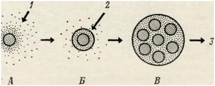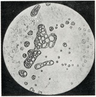В описываемых нами условиях силы взаимного отталкивания одноименно заряженных частиц могут быть преодолены силами, стремящимися уменьшить поверхностную энергию системы, и частицы, сближаясь, будут образовывать агрегаты. Однако остаточные, хотя и сильно редуцированные, гидратные оболочки частиц все еще будут разделять их и препятствовать полному слиянию. Если указанный процесс будет продолжаться достаточно долго, то наступит флоккуляция и образование коацерватных капель, имеющих макроскопические размеры (фото I). Большая часть растворителя при этом удаляется, а образующиеся коацерватные капли представляют собой концентрированный раствор коллоида. Первоначально стабильная коллоидная система оказывается при этом разделенной на две четко различающиеся фазы, содержащие агрегаты коллоидных частиц различной концентрации.