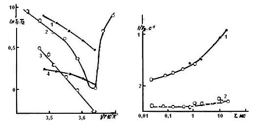 В то же время в работе по температурной зависимости ширины линии ЯМР в клатратах ксенона выше 277° К получили величину Еа — 24,7±3,3 кДж⁄моль. Авторы работы считают, что эта энергия активации характеризует подвижность молекул в ячейках клатратов, так как используемый метод получения клатратов основывается на длительном выдерживании сильно измельченных кусочков льда при отрицательных температурах под высоким давлением ксенона и якобы исключает наличие какого-либо количества жидкой воды. Однако узкая линия ЯМР-поглощения, наблюдаемая на фоне широкой линии от протонов твердой фазы клатратов, скорее всего обусловлена жидкой водой, присутствующей на поверхности крупинок льда и не связанной в клатраты. Поэтому величина энергии активации, близка к величине Еа для жидкости, полученной в настоящей работе, и не может отражать состояние молекул в жестких клатратных структурах. Заметим, что определение энергии активации по таким графикам, когда при изменении температуры меняются не только подвижность молекул воды, но и соотношение жидкой и твердой фаз, представляется недостаточно корректным. Как отмечалось, исследуемые образцы представляли собой смесь клатратного льда и значительного количества жидкой воды (70—80 % молекул в образце). При этом жидкая вода при перевертывании ампул не выливалась, что указывает на ее распределение в капиллярах между жесткими клатратнымн структурами. На существование микрогетерогенности указывает и снижение измеряемой величины Т2 протонов воды при образовании клатратов ксенона (см. рис. 2). В работе [2] отмечалось, что в гетерогенных системах из-за разницы в магнитных восприимчивостях жидкости и твердого тела на границе раздела фаз в магнитном поле возникает градиент намагниченности. В результате .движение протонов молекул жидкой фазы в пограничном слое приводит к быстрому распаду ядерной намагниченности и снижению измеряемой величины Т2. Авторы работы [2] считают, что применение по¬следовательности Карра—Парселла—Мейбума—Гилла при измерении Т2 позволяет однозначно выделить вклад в релаксационный распад ядерной намагниченности, обусловленный диффузией частиц в неоднородном магнитном поле, и оценить величину неоднородности поля в объеме образца. Поэтому для оценки степени неоднородности раствора в настоящей работе было проведено исследование зависимости скорости поперечной релаксации 1⁄Т2 от интервала τ между импульсами в серии Карра—Парселла для воды с клатратами и без них (рис. 3). Скорость поперечной релаксации протонов молекул жидкой воды при изменении τ в диапазоне от 0,01 до 10 мс изменяется слабо, тогда как в присутствии клатратов 1⁄Т2 заметно увеличивается с возрастанием τ, когда величина τ превышает 1 мс. Используя известное соотношение для зависимости длины свободного пробега молекул от коэффициента самодиффузии х2 = 2Дτ, можно оценить характерный размер неоднородной области, в которой диффузионное движение молекул влияет на спад сигнала спинового эха. Эта оценка дает величину неоднородностей х ≥ мкм, что свидетельствует о том, что характерные размеры кристаллов клатратов ксенона, образующихся в чистой воде, — порядка 1 мкм. На основании изложенных результатов можно сделать такие выводы. Разработана методика получения клатратов газов в ампулах для ЯМР-исследований под давле