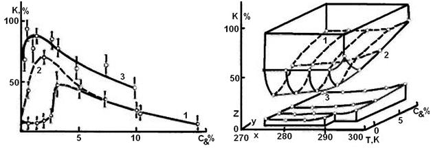 На рис. 1 видно, что существенное снижение количества клатратов происходит уже с концентрации белка 7—10%. Возможно, что соотношение числа полярных и неполярных групп на поверхности белковых молекул определяет положение и величину максимумов для трех исследованных растворов белков. При исследовании процесса продольной релаксации протонов в водных растворах ЯА с клатратами ксенона был обнаружен неэкспоненциальный характер восстановления продольной намагниченности, для которой выделены две компоненты времени спинрешеточной релаксации Т1. В диапазоне температур 275—290° К время релаксации медленной компоненты при частоте резонанса 20 МГц равнялось 300— 400 мс, а быстрой — 20—40 мс. На рис. 2 по оси х обозначена температура, по оси у — концентрация альбумина, по оси z — относительная доля воды в разных фазах, определенная методом ЯМР. Диаграмма получена по данным ЯМР следующим образом. Долю фазы 1, соответствующую воде в твердых клатратных структурах, определяли по методике работы [5]. Количественное соотношение фаз 2 и 3 вычисляли по амплитудам медленной и быстрой компонент времени продольной релаксации Т1. Для водных растворов САБ с клатратамн ксенона спад сигнала спинового эха на частоте резонанса 20 МГц разлагался на две экспоненциальные кривые, характеризующиеся медленным и быстрым временем поперечной релаксации T2. Быстрая компонента в исследованном интервале концентраций белка 0—10 % составляла 0,5—2 мс, а медленная изменялась от 10 до 100 мс в зависимости от количества клатратов и была снижена по сравнению с ее величиной в растворе без клатратов (300—900 мс). Кроме того, при образовании клатратов в растворах САБ снижалась и величина Т1 протонов водной компоненты. Когда в растворе белка образуются клатраты ксенона, количество жидкой воды уменьшается. В результате возрастает концентрация (белка относительно жидкой фазы и монотонно растет скорость продольной релаксации протонов воды в растворах САБ с клатратами ксенона (рис. 3). На рис. 3 видно, что ход зависимости роста скорости продольной релаксации 1⁄Т1 Для растворов САБ с клатратамн ксенона повторяет концентрационную зависимость 1⁄Т1 для растворов без клатратов. Такое поведение говорит о том, что на образование клатратов идет свободная вода, а подвижность оставшейся жидкой воды снижается. Об уменьшении подвижности воды при образовании клатратов свидетельствует также поведение величин энергий активации Eа движений молекул воды, определенных по линейным участкам зависимости ln Т1 для растворов ЯА с клатратами ксенона. При температурах 275—287° К в растворах ЯА величина Еа была близка к значению для чистой воды и составляла 16,8 кДж⁄моль. При образовании клатратов ксенона величина Еа возрастала в пределах 20,9—22,6 кДж⁄моль. По сравнению с поведением l/T1 (см. рис. 3) характер поведения зависимости скорости поперечной релаксации 1/Т2 протонов воды от концентрации белка в жидкой фазе образцов с клатратами отличается от аналогичной зависимости в растворах без клатратов (рис. 4). При анализе этих кривых можно заметить, что при образовании клатратов на Т2, кроме уменьшения количества свободной воды, возможно, влияет еще ряд факторов, в частности гетерогенность образцов. Поскольку наличие области клатратов с жесткой решеткой из молекул воды должны приводить к появлению магнитной неоднород