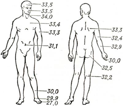 Наличие в организме зон с разной температурой не позволяет однозначно определить температуру тела. Для характеристики ее часто пользуются понятием средневзвешенной температуры, которую вычисляют как среднюю температур всех участков тела. Более точно температуру тела может характеризоваться температурной схемой — распределением температуры по поверхности тела (рис. 1.) или в его ядре. Используется также характеристика температуры тела градиентом температуры, который изображается вектором, направленным в сторону наибольшего значения температуры, причем величина вектора соответствует изменению температуры, приходящемуся на единицу длины. Изображение температурной схемы тела в виде изотерм и значений градиента взаимно дополняют друг друга: чем ближе расположены изотермы, тем больший градиент температур имеют участки тела.